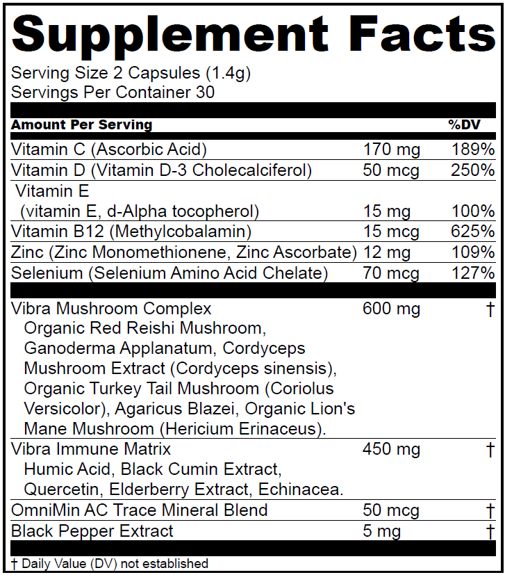 Chaga Extract, Ganoderma Lucidum, Turkey Tail, Ganoderma Applantum, Lions Mane, Elderberry Extract, Humic/Fulvic Acid, Quercetin Dihydrate, Black Cumin Extract, Echinacea Extract, Ascorbic Acid (Vitamin C), Zinc Ascorbate, Zinc Monomethionine, Vitamin D3, Vitamin E, Selenium, B12, Black Pepper Extract, Trace Mineral Blend