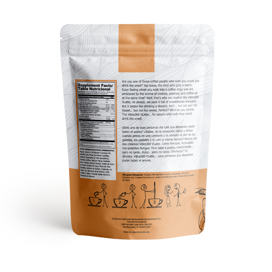 Are you one of those coffee people who wish you could just drink the smell? You know, the kind who gets a warm, fuzzy feeling when you walk into a coffee shop and are embraced by the aroma of cookies, pastries, and coffee all at the same time? Well, that's why we created the Vibra360 VLatte. As always, we pack it full of powerhouse mushrooms. But it tastes like drinking a dessert. Rich... but not too rich. Sweet... but not too sweet. Perfect? We'll let you decide. The Vibra360 VLatte... for people who wish they could drink the smell.