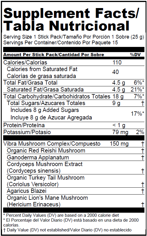 Custom roasted Arabica coffee beans, non-dairy coconut creamer, raw cane sugar, blended with a proprietary myco-mix mushroom blend (Ganoderma Lucidum, Ganoderma Applantum, Cordyceps, Turkey Tail, Agaricus Blazei, Lion’s Mane)